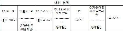 6일 금융권에 따르면 휴대폰 부품업체 N사 직원은 삼성전자로 부터 휴대폰을 구입해 KT ENS에 납품하고 여기서 발생한 매출채권을 특수목적법인(SPC)에 양도한 뒤 이를 담보로 1, 2금융권에서 대출을 받았다. 이 과정에서 N사 직원과 KT ENS 직원이 서로 짜고 매출채권을 가공했다.
