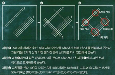 이는 곱셈을 덧셈으로 환원하는 원리를 이용한 것으로 교차점의 개수에 따라 수를 더한 값이 되며 그 중에서도 '구구단 필요 없는 곱셈법'은 두 자리 수 이상을 곱셈할 때 활용도가 높은 것으로 전해졌다.