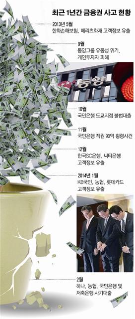 급기야 연초에는 사상 최대 규모의 고객정보 유출 사건이 벌어진 데 이어 일부 은행들이 대출사기에 연루되는 등 악재가 겹치는 상황까지 초래됐다. 외국계 은행에서 고객정보가 유출된 데 이어 KB국민카드, 농협카드, 롯데카드 등 3개 카드사에서 무려 1억 건이 넘는 고객정보가 유출됐다. 엎친 데 덮친 격으로 하나·NH농협·국민은행과 10개 저축은행이 3000억원대의 초대형 대출사기를 당한 사실이 금융감독원에 적발됐다. 2008년 5월부터 6년간 100여 차례나 계속된 대출사기를 눈 뜨고 당한 것이다.