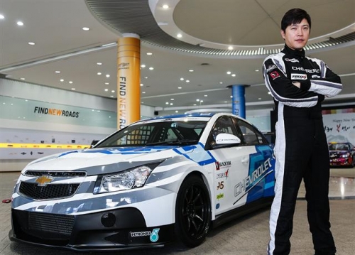 ▲한국지엠의 쉐보레 레이싱팀이 배우 겸 카레이서 안재모 선수를 새로 영입하고, 2014년 시즌 슈퍼레이스에 출전한다. 사진은 쉐보레 레이싱팀에 새로 영입된 배우겸 카 레이서 안재모 선수가 쉐보레 크루즈 레이싱카 앞에서 포즈를 취하고 있는 모습. 사진제공 한국지엠