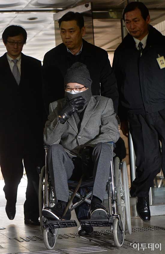 [포토] 휠체어 타고 출석하는 '이재현 CJ그룹 회장'
