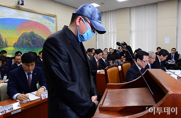개인정보 대량유출 관련 실태조사 및 재발방지를 위한 국정조사 청문회가 18일 오전 여의도 국회 정무위원회에서 열렸다. 증인으로 출석한 전 KCB 직원 박 모 씨가 의원들의 질의에 답변하고 있다. 노진환 기자 myfixer@