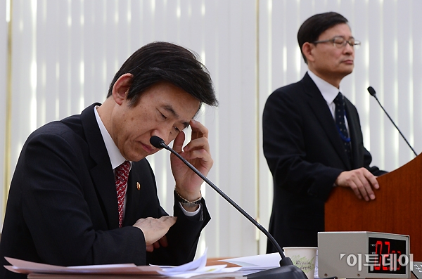 윤병세 외교부 장관(왼쪽)과 조백상 중국 선양 총영사가 21일 오전 여의도 국회 외교통일위원회 전체회의에 참석해 서울시 공무원 간첩사건 증거조작 논란과 관련한 의원들의 질의에 곤혹스러워하고 있다. 노진환 기자 myfixer@