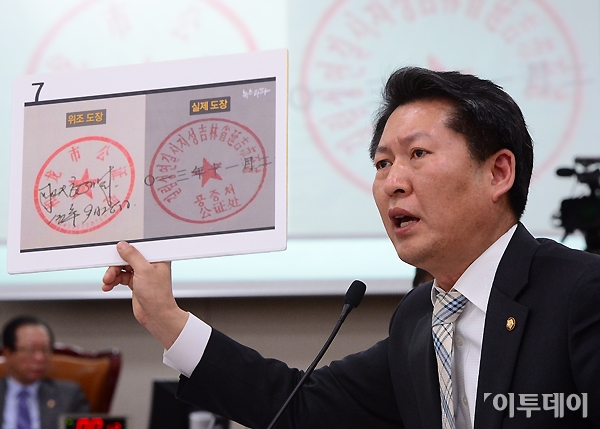정청래 민주당 의원이 21일 오전 여의도 국회 외교통일위원회 전체회의에서 윤병세 외교부 장관과 조백상 중국 선양 총영사에게 서울시 공무원 간첩사건 증거조작 논란과 관련한 질문을 하고 있다. 노진환 기자 myfixer@
