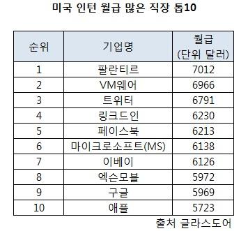 데이터 보안업체 팔란티르가 순위에서 1위를 차지했는데 이 회사 인턴 월급은 7012달러에 이른다. 연봉으로 따지면 8만4000달러에 이르는 수치라고 CNN머니는 전했다.