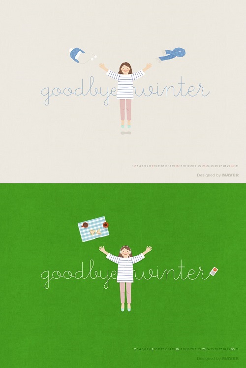 올해 3월 바탕화면 이미지에는 '굿바이 윈터'라는 문구와 함께 목도리와 모자를 날려버리는 소녀가 봄을 반기는 듯한 모습을 하고 있다.