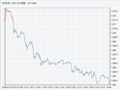 6일 서울 외환시장에서 원·달러 환율은 전 거래일보다 6.8원 내린 1064.1원에 거래를 마쳤다. 이날 환율은 0.6원 오른 1071.5원에 개장했으나 오전 9시30분쯤 내림세로 돌아선 후 줄곳 하락했다.