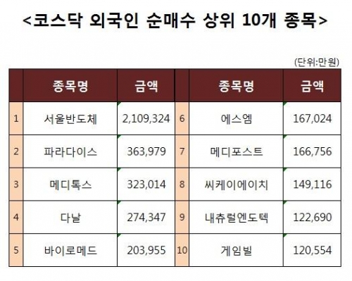 [코스닥 외국인 순매수 상위 10개 종목]