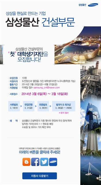 지원 전형과 기타 자세한 사항은 삼성물산 건설부문 공식 블로그(http://www.samsungblueprint.com)에서 확인할 수 있다. 문의 02-2145-6442