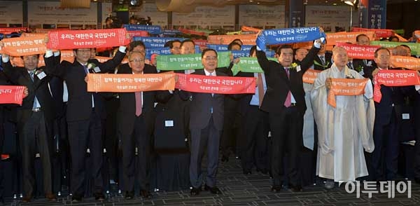 '작은 실천 큰 보람 운동 선포식'이 12일 오후 서울 세종문화회관에서 열렸다. 이 날 정홍원 국무총리와 현오석 경제부총리 등 참석자들이 퍼포먼스를 하고 있다. 최유진 기자 strongman55@