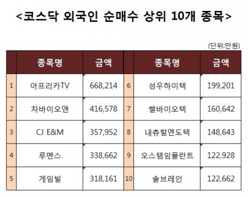 13일 코스닥 외국인 순매수 상위 10개 종목