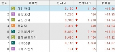 아프리카 TV와 엘컴텍도 전일대비 14.94%씩 오른 1만8850원, 3385원에 장을 마쳤다.