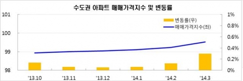 수도권 아파트 매매가격은 지난해 10월부터 조금씩 상승을 거듭해 3월 현재 6개월 연속 상승(0.73%)하고 있는 것으로 나타났다. 6개월 연속 상승한 것은 지난 2009년 5월부터 10월까지 상승한 이후 4년여 만에 처음이다.