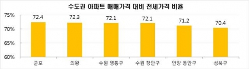 수도권 중 군포(72.4%), 의왕(72.3%), 수원 장안구(72.1%), 수원 영통구(72.1%), 안양 동안구(71.2%)는 전세가 비율이 70%대를 넘어 계속 상승하고 있으며 서울 성북구는 서울지역으로는 조사 이후 최초로 70%대(70.4%)에 진입했다.
