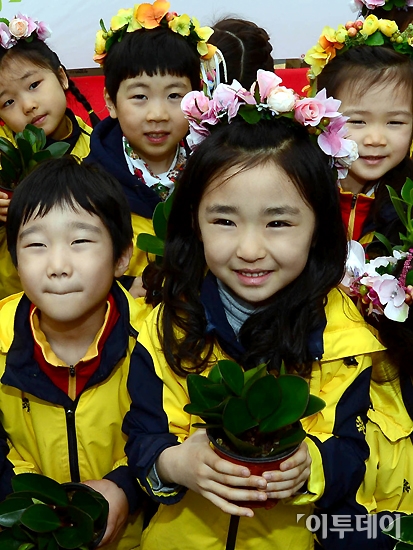 대상(주) 청정원이 한국산림복지문화재단과 함께 25일 오전 서울 청계광장 앞에서 ‘희망의 1만 그루 나무 나누기’ 행사를 개최했다. 행사에 참여한 우경유치원 어린이들이 공기정화식물을 들고 밝게 웃고 있다. 노진환 기자 myfixer@