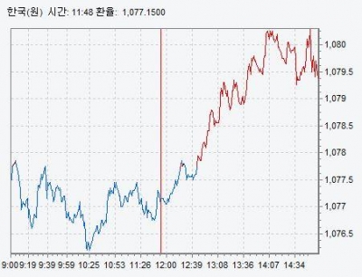 25일 서울 외환시장에서 원·달러 환율이 전일보다 1.6원 오른 1079.4원 거래를 마쳤다. 이날 환율은 1.3원 내린 1076.5원에 거래를 시작했으나 오후 12시반쯤 상승세로 전환됐다.