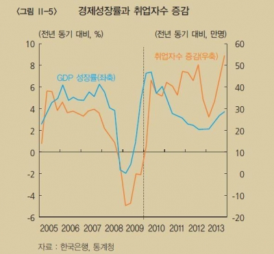 한국은행이 28일 발표한 ‘2013년 연차보고서’에 따르면 우리나라의 국내총생산(GDP) 성장률과 취업자수 증가폭은 유사한 흐름을 보여왔지만 금융위기 이후 두 지표 간 상관관계가 악화된 것으로 나타났다.