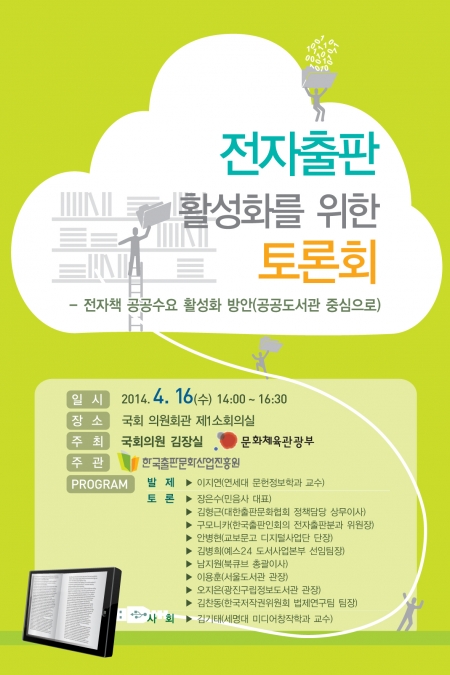 국회 김장실 의원과 문화체육관광부, 한국출판문화산업진흥원은 한국 전자출판 활성화를 위해 16일 국회 의원회관 제1소회의실에서 ‘전자책 공공수요 활성화 방안-공공도서관 중심으로’를 주제로 세미나를 진행한다.