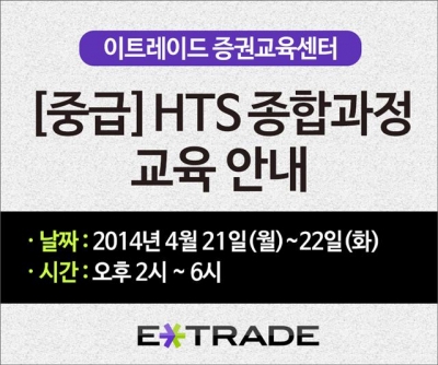 이트레이드증권은 오는 21일부터 이틀간 여의도 사학연금회관 10층 이트레이드증권 교육장에서 ‘HTS 종합과정 교육’을 진행한다고 14일 밝혔다.