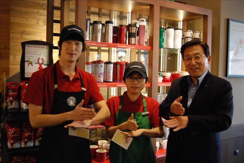 ▲이석구 스타벅스커피코리아 대표가 장애인 바리스타인 이소현씨(가운데)에게 칭찬카드를 전하며 수화로 '감사합니다'라며 격려하고 있다. 사진제공 스타벅스커피코리아