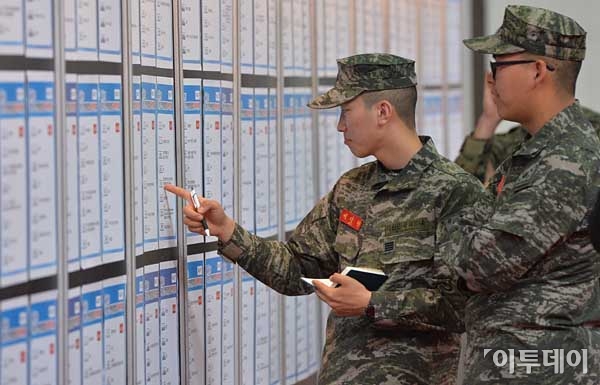 중소기업중앙회가 국방부 등과 함께 공동으로 개최한 ‘2014 전역예정장병 일자리 박람회’가 17일 경기 일산 킨텍스에서 열렸다. 이날 행사장을 찾은 장병들이 채용정보게시판을 살펴보고 있다. 이번 행사는 18일까지 열린다. 최유진 기자 strongman55@