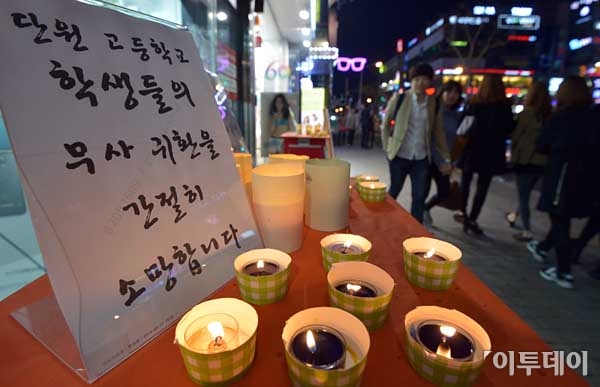 세월호 침몰사고가 발생한지 닷새째에 접어들었다. 20일 오후 경기 안산시 번화가에 위치한 한 휴대폰매장 앞에 단원고 학생들의 무사귀환을 기원하는 문구와 촛불이 자리잡고 있다. 최유진 기자 strongman55@