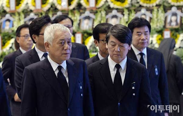 새정치민주연합 김한길(왼쪽), 안철수 공동대표가 23일 오후 경기도 안산올림픽기념관 실내체육관에 마련된 '세월호 사고 희생자 임시합동분향소'를 찾아 조문을 한 뒤 분향소를 나오고 있다. 최유진 기자 strongman55@