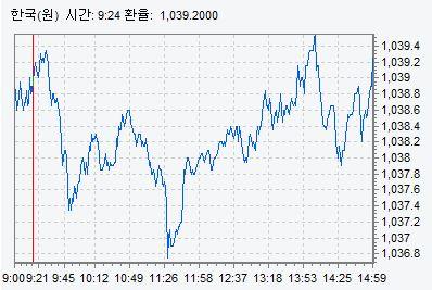 24일 서울 외환시장에서 원·달러 환율은 전일보다 0.6원 내린 1039.2원에 거래를 마쳤다. 이날 환율은 0.2원 오른 달러당 1040.0원에 거래를 시작했으나 곧바로 하락세로 전환됐다.