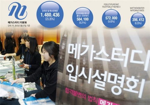 ◇‘경영권’ 누구의 손에 = 손주은 대표(19.83%)를 포함한 특수관계인 지분 23.35%와 코리아에듀케이션홀딩스 지분 9.21%를 합친 32.56%가 매각 대상이다. 코리아에듀케이션홀딩스는 사모펀드 H&Q아시아퍼시픽코리아가 2012년 메가스터디에 투자하기 위해 설립한 특수목적회사(SPC)로 H&Q는 2012년 메가스터디의 2대 주주 한국투자증권계열 코너스톤에퀴티파트너스가 보유하고 있던 9.21%(58만4100주)를 주당 11만400원에 인수했다. 하지만 주가는 꾸준히 하락세를 보여 4월 28일 종가는 6만8300원을 기록했다.