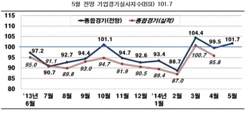 29일 전국경제인연합회가 매출액 기준 600대 기업을 대상으로 실시한 기업경기실사지수(BSI) 조사 결과에 따르면, 5월 종합경기 전망치는 101.7을 기록했다. 지난달 99.5를 기록해 기준치 100을 하회했던 것과는 소폭 개선됐다.