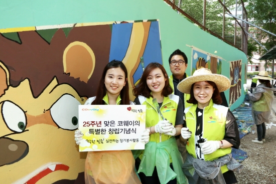코웨이 임직원들은 지난 9일 본부별로 보육원 영아 돌보기, 장애아동과 나들이, 독거노인 집 보수, 농촌 일손돕기, 국립공원 환경정화 등 다양한 봉사활동과 함께 7500만원을 기부했다. 지난 2일 창립기념일을 의미 있게 보내기 위해 본부별 특색 있는 정기봉사 활동을 진행했다.