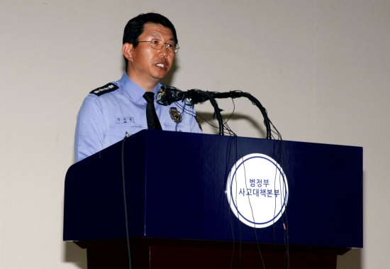 ▲김석균 해양경찰청장이 12일 오후 진도군청에서 열린 브리핑에서 세월호 침몰 당시 해경이 선체로 진입해 승객을 구조할 수 있었음에도 방치해 검찰이 업무상 과실치사 혐의 적용을 검토한다는 일부 언론 보도에 대해 사실과 다르다고 해명하고 있다. (사진=연합뉴스)