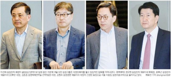 회의에 앞서 이날 서초동 삼성전자 본관 로비 분위기는 여느 수요일과 달랐다. 오전 6시가 되기 전부터 취재진들이 몰렸고, 로비 한 쪽에는 포토라인이 마련되기도 했다. 취재진이 출근하는 임원진에게 접근하는 것도 평소와 달리 제한됐다. 로비에 모습을 드러낸 사장단들은 한 결같이 긴장 속에 굳은 표정을 지었다.