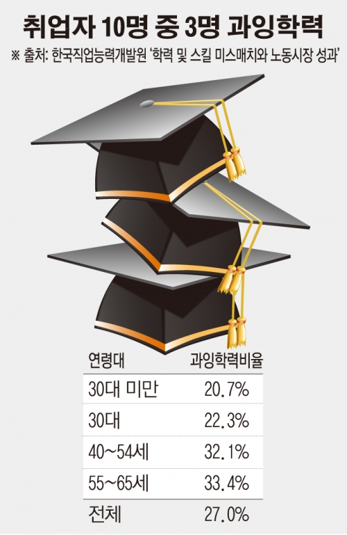 과잉 학력은 연령이 높고 중소기업일수록 높았다. 연령별로는 40∼54세가 32.1%, 55∼65세 33.4%로 나타나 30대 미만 청년층(20.7%), 30대(22.3%)보다 높았다.
