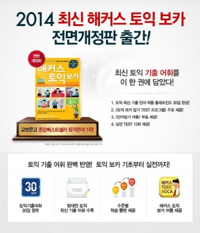 지난해 교보문고 등 주요서점 토익 베스트셀러 1위를 기록했던 해커스 토익 보카의 2014 전면개정판은 최근 토익시험 빈출 어구, 혼동되는 단어, 문법 포인트, 출제 패턴 등을 분석해 어휘시험 뿐만 아니라 문법시험 대비도 가능하도록 개정됐다.
