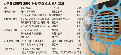 먼저 정부는 6월초 해양경찰청 해체와 안전행정부·해양수산부 기능 축소, 국가안전처 신설 등 정부조직법을 국회에 제출할 예정이다. 또 퇴직공직자 취업제한 강화, 공직 인사시스템 혁신 등 공직자윤리법 개정안과 세월호 사고 진상조사위원회 구성을 위한 특별법도 함께 국회에 제출하기로 했다.