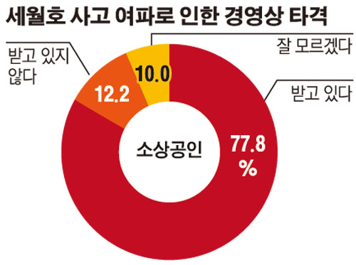 세월호 사고 여파로 소상공인들의 매출은 지난해 4~5월 대비 33.4% 감소했고, 사고 이전과 대비해서는 37.1% 줄었다. 소상공인들은 매출액 감소로 인해 ‘차입금 등 부채증가’(27.8%), ‘세금 등 각종 공과금 체납’(23.4%), ‘임대료 등 각종 대금 납부 지연’(21.8%), ‘사장월급 반납’(21.2%), ‘은행 등 대출상환 지연’(19.0%) 등의 피해를 겪고 있는 것으로 나타났다.