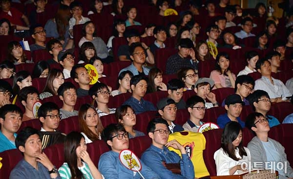 대통령직속 청년위원회가 주최한 '스펙초월 채용 설명회'가 28일 오후 서울 건국대에서 열렸다. 이날 행사에 참석한 수도권지역 대학생과 취업준비생들이 현대차,SK,포스코,네이버,두산,산업은행,한국남동발전 인사채용담당자들의 채용제도 소개를 경청하고 있다. 최유진 기자 strongman55@