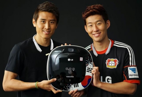 ▲대한민국 축구대표팀 구자철, 손흥민 선수가 로봇청소기‘로보킹’을 들고 있다. (사진=LG전자)