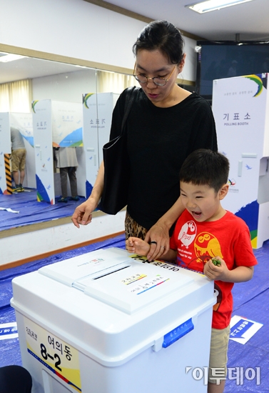 제6회 지방선거일인 4일 오전 서울 영등포구 여의동 제2투표소가 마련된 여의도여고에서 부모와 함께 온 어린이가 투표를 하고 즐거워 하고 있다.