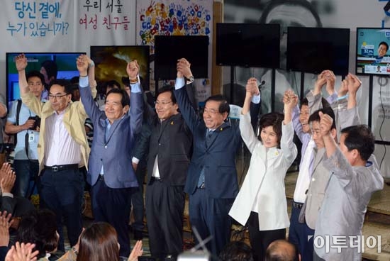 박원순 서울시장 후보가 부인인 강난희씨와 함께 지방선거가 열린 4일 오후 종로구 박원순 선거캠프에서 박후보의 당선확인 후 지지자들과 함께 만세를 외치고 있다.