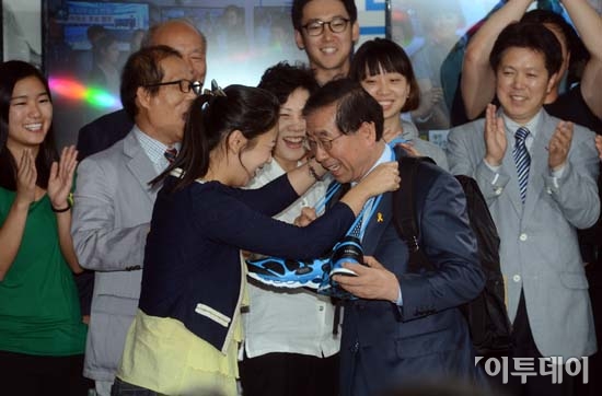 새정치민주연합 박원순 후보가 5일 자정께 서울시 종로구 박원순 후보 캠프에서 당선 기념으로 지지자로부터 선물을 받고 즐거워 하고 있다.