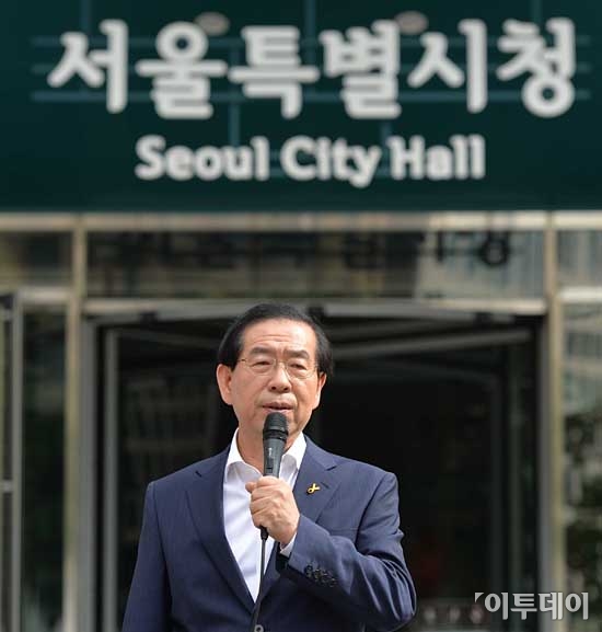 박원순 서울시장 당선자가 5일 오전 서울시청 앞에서 취재진을 향해 당선소감을 밝히고 있다. 최유진 기자 strongman55@