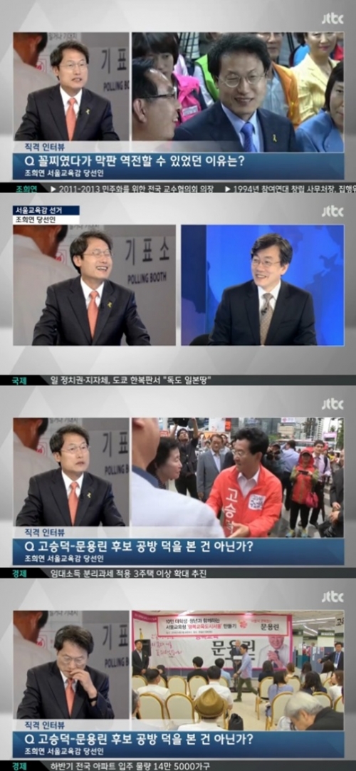 5일 JTBC '뉴스9'에는 조희연 서울시 교육감 당선자가 출연해 인터뷰를 가졌다.