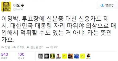 이명박 전 대통령의 신분증 해프닝을 접한 소설가 이외수 씨는 5일 자신의 트위터에 한 마디 평울 올렸다. 그는 "이명박, 투표장에 신분증 대신 신용카드 제시. 대한민국 대통령 자리 따위야 외상으로 매입해서 먹튀할 수도 있는 거 아냐, 라는 뜻인가요."라는 트윗을 올렸다.