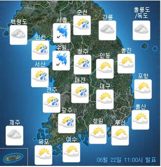 이날 기상청에 따르면 중부 내륙 오후부터 소나기 강수확률은 60∼80%로, 일부 지역에서는 돌풍이 불거나 천둥·번개가 칠 가능성도 있다.