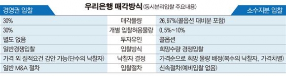 ◇‘30% 통매각’ 교보생명 외 입찰 참여 관건 = 예금보험공사가 보유하고 있는 우리은행 총 지분은 56.97%다. 금융위는 이 가운데 30%는 두 곳 이상이 경쟁에 참여해 더 좋은 조건을 제시한 쪽에 일반경쟁입찰 방식으로 팔고, 나머지 26.97%는 투자자별로 10% 미만 한도 내에서 원하는 수량만큼 살 수 있는 희망수량입찰 방식으로 넘길 계획이다.