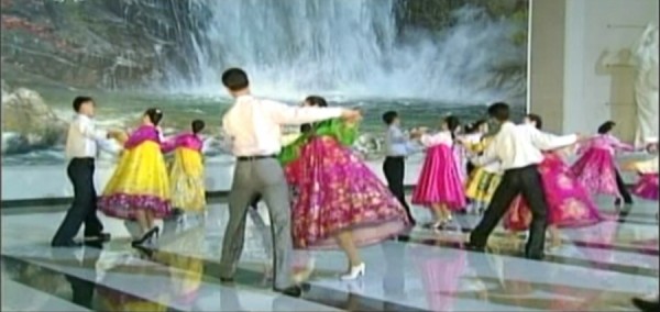 22일 조선중앙TV가 공개한 8가지 종류의 '새로 창작ㆍ형상한 군중무용' 영상 캡쳐. 국악 장단에 디스코 리듬을 곁들인 곡에 맞춰 젊은 남녀가 춤을 추는 가운데 여성이 신고 있는 10cm 가량의 '킬힐'이 단연 눈에 띈다.