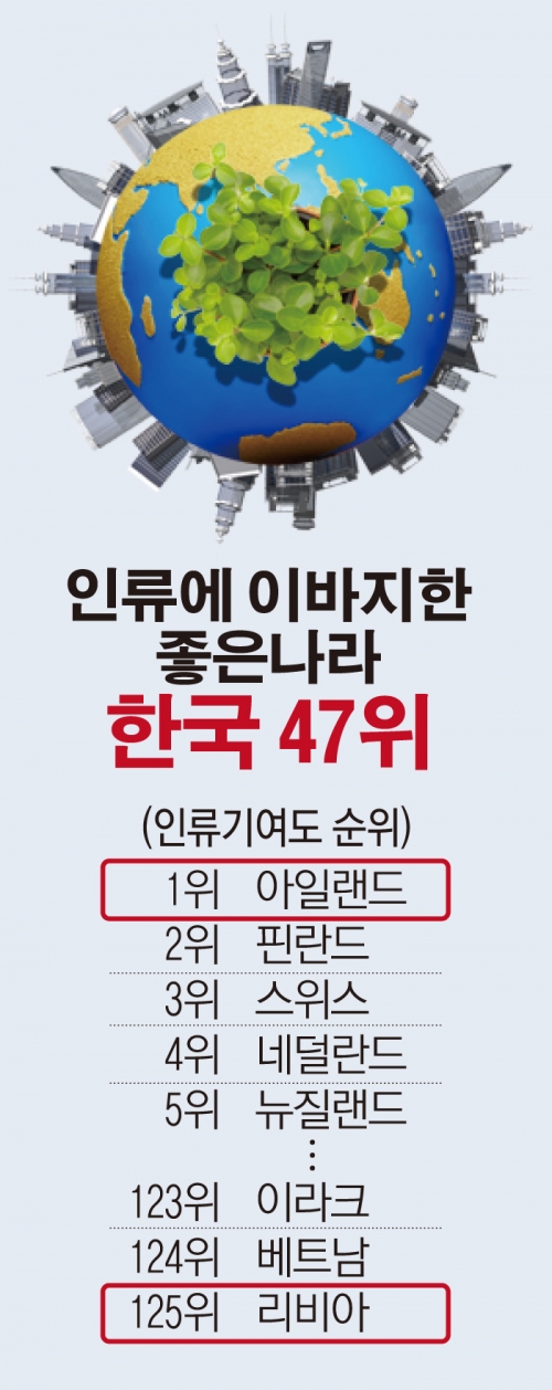 조사대상 125개국 가운데 인류 공동선을 위한 기여도가 가장 높은 나라로 아일랜드가 선정됐으며 핀란드(2위)ㆍ스위스(3위)ㆍ네덜란드(4위)ㆍ뉴질랜드(5위)가 톱5에 들었다. 이라크(123위)ㆍ베트남(124위)ㆍ리비아(125위)가 최하위권에 머물렀다.