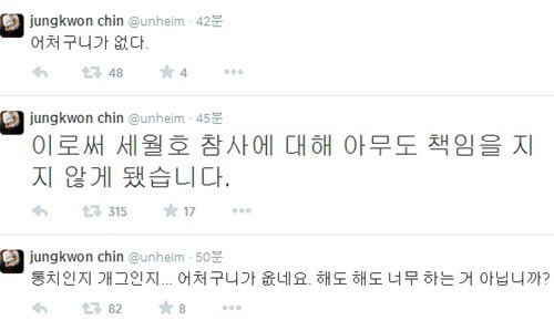 진중권 교수는 26일 자신의 트위터에 "통치인지 개그인지 어처구니가 없다. 해도 해도 너무 하는 것 아닌가?"라며 "이로써 세월호 참사에 대해 아무도 책임을 지지 않게 됐다"고 지적했다.